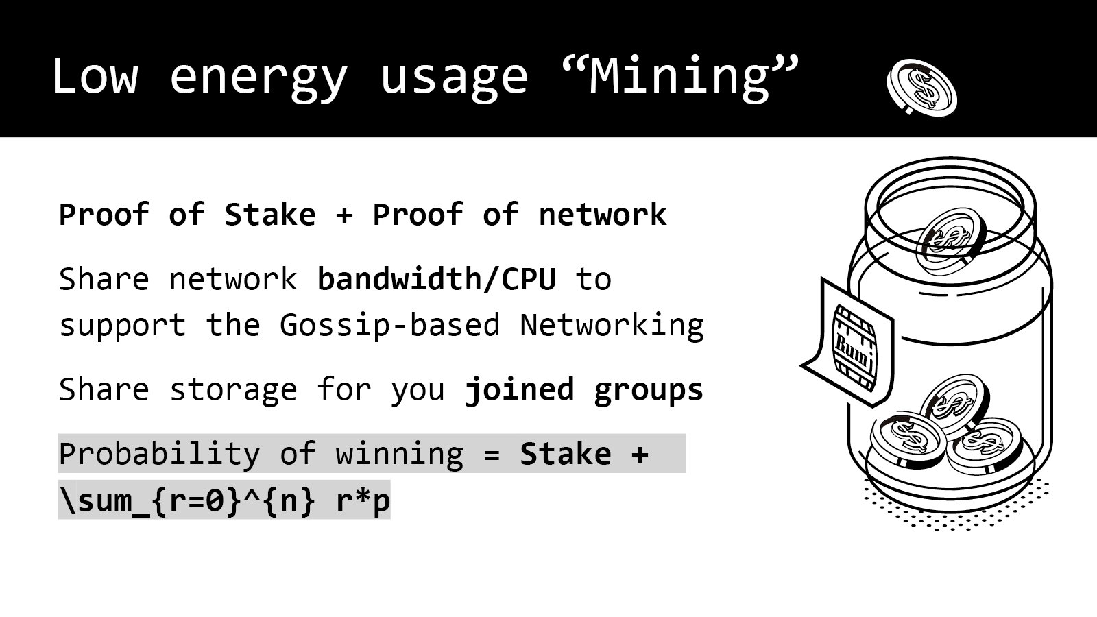 终于讲到大家关心的“挖矿”这部分了, 我在“挖矿”这个词上加了个引号,因为它跟,—— 刚才说了,它跟那种高能耗的挖矿是不一样的,因为不需要去建一个矿场。
